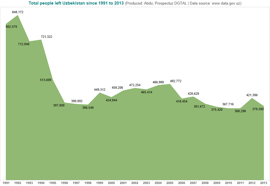 One of such sound initiatives was the recent launch of the open data portal of the Republic of the Uzbekistan - www.data.gov.uz, which aims to promote data democracy by offering valid social, economic and other types of data sets for all those interested parties in the form of .csv, .json, .xml formats through its website. Although the website is only few months old now, it already contains over 250 data sets, provided by over 25 government organisations, and which have already been downloaded nearly 15,000 times. And as I live and breathe data in my daily jobs, I decided to explore it myself and share with you some of the interesting insights I found. To start with, I picked the data related to number of people who left Uzbekistan between 1991-2013, cleaned the data files (more on that at the end), analysed and visualised, so here what I came up with.