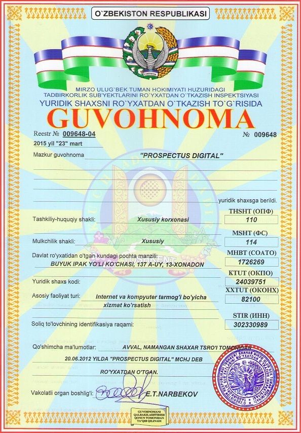We are pleased to inform that Prospectuz DGTAL's strategic regional partner in Uzbekistan, Prospectus Digital LLC has transformed its legal entity ownership form into a Private Enterprise (PE) status, having officially been re-incorporated in the city of Tashkent on the 23rd Mar 2015. From now on the company will be operated as Prospectus Digital Private Enterprise or Prospectus Digital PE.
